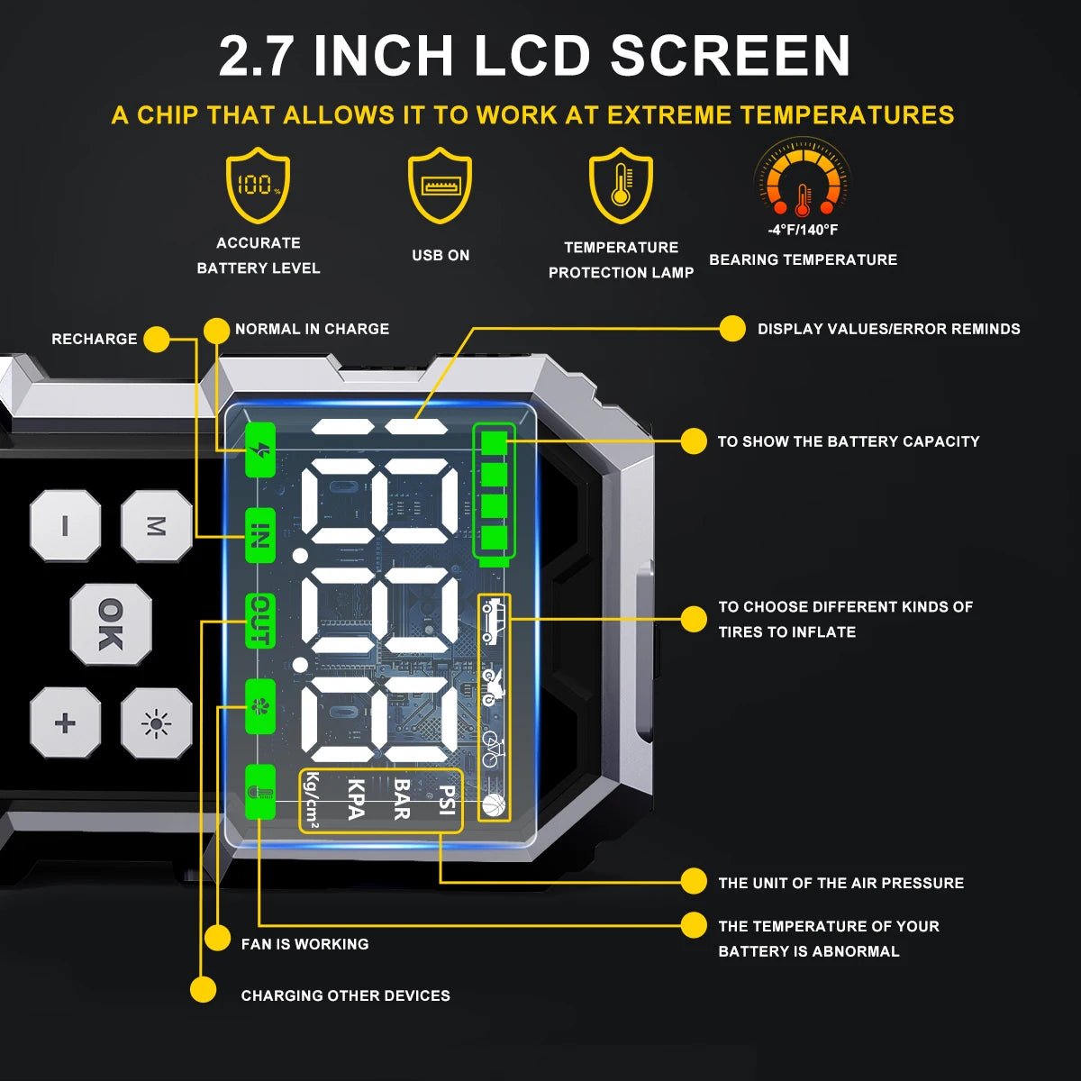 Its large LCD screen displays pressure, voltage, and charge level, while the tough body ensures durability on the road.