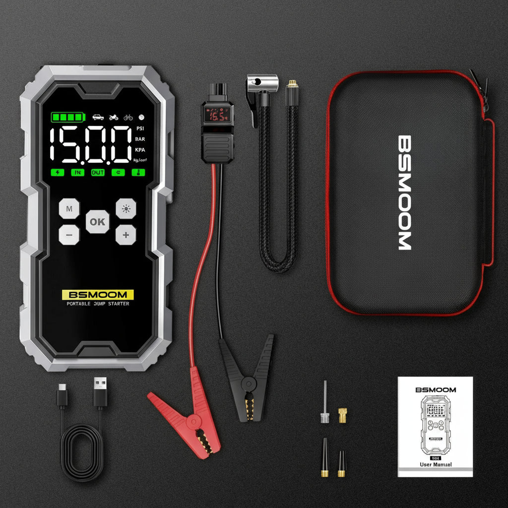 The BSMOOM PowerJump with 21800/26800mAh is a powerful 4-in-1 car jump starter, air compressor, power bank, and LED flashlights designed for drivers who want reliability anywhere.