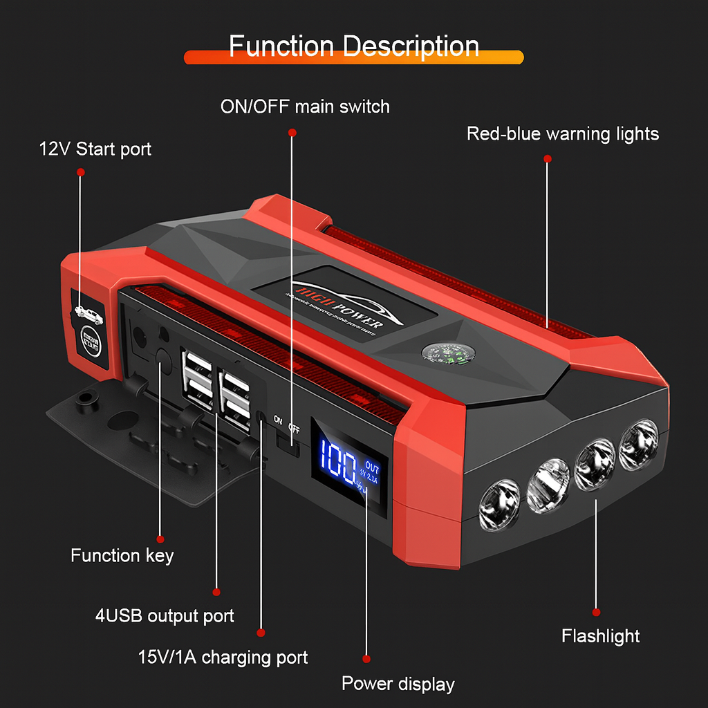 High Power Boost 30000 is a compact yet powerful car jump starter with a massive 30,000mAh capacity. Designed for 12V vehicles up to 6.0L (gasoline) and 4.0L (diesel) engines, it ensures a reliable start in emergencies. The high-power output and smart protection system make it safe and efficient even in extreme conditions.